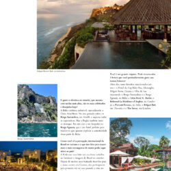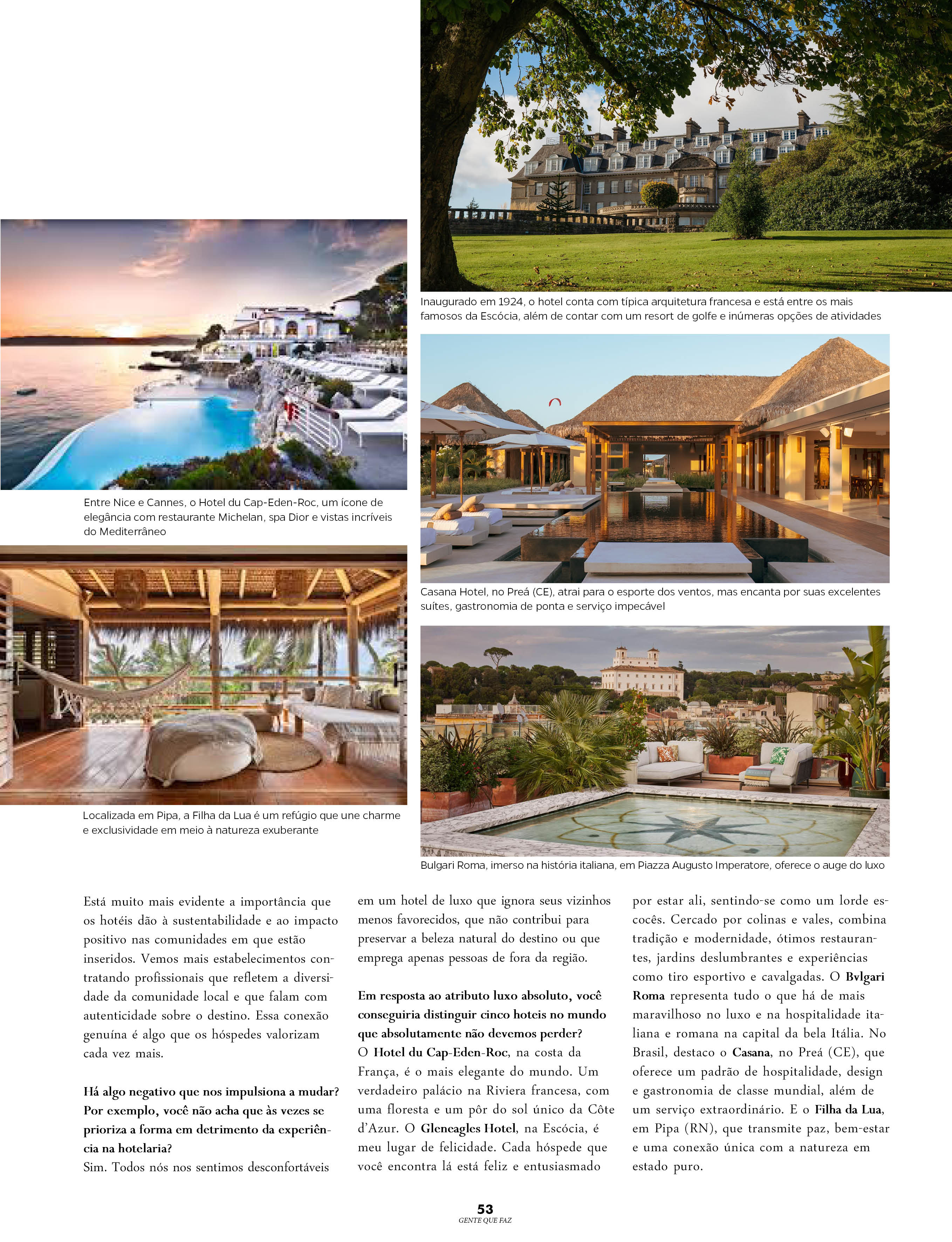 O Hotel du Cap-Eden-Roc, na costa da França, é o mais elegante do mundo. Um verdadeiro palácio na Riviera francesa, com uma floresta e um pôr do sol único da Côte d’Azur. O Gleneagles Hotel, na Escócia, é meu lugar de felicidade. Cada hóspede que você encontra lá está feliz e entusiasmado por estar ali, sentindo-se como um lorde escocês. Cercado por colinas e vales, combina tradição e modernidade, ótimos restaurantes, jardins deslumbrantes e experiências como tiro esportivo e cavalgadas. O Bvlgari Roma representa tudo o que há de mais maravilhoso no luxo e na hospitalidade italiana e romana na capital da bela Itália. No Brasil, destaco o Casana, no Preá (CE), que oferece um padrão de hospitalidade, design e gastronomia de classe mundial, além de um serviço extraordinário. E o Filha da Lua, em Pipa (RN), que transmite paz, bem-estar e uma conexão única com a natureza em estado puro.