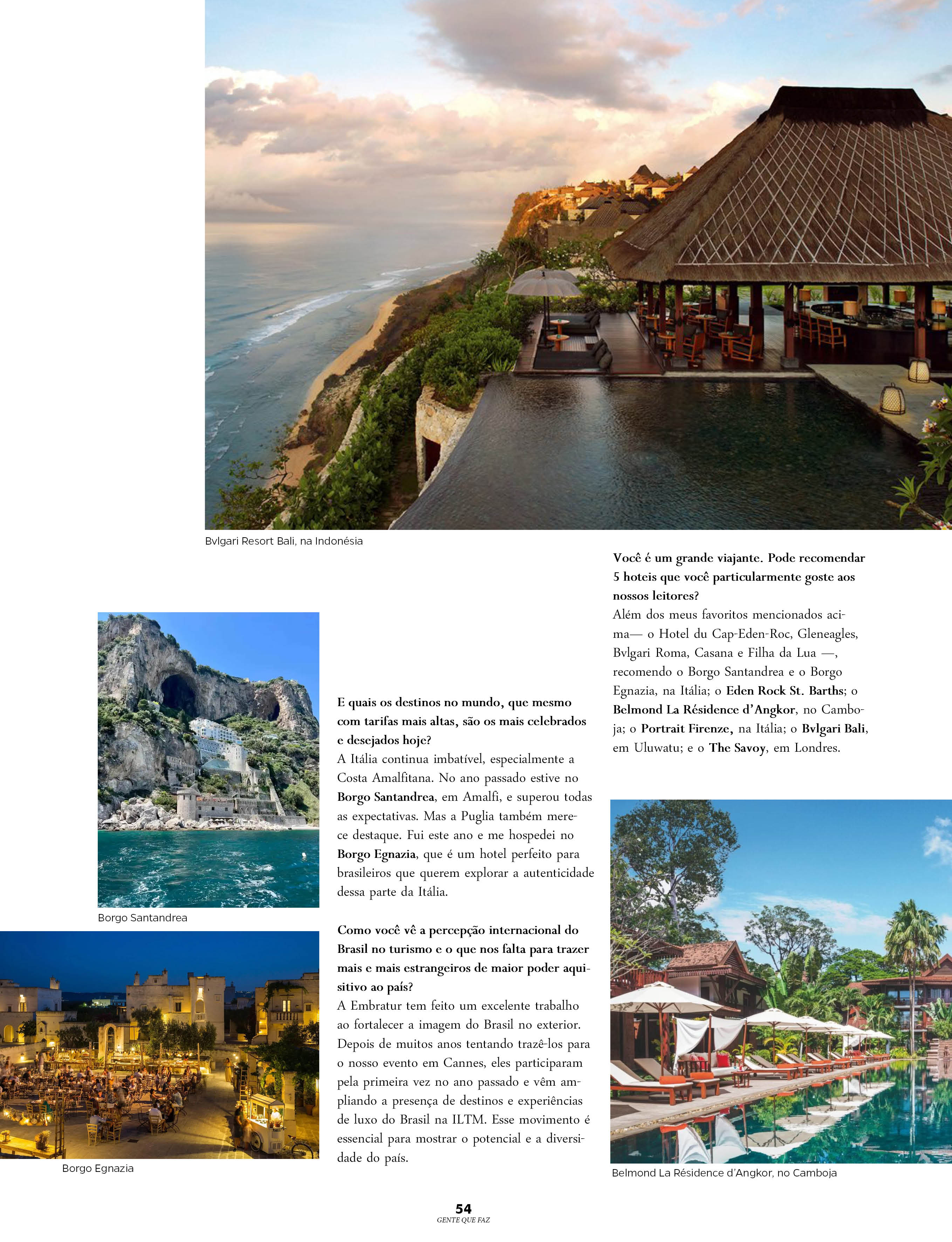 A Itália continua imbatível, especialmente a Costa Amalfitana. No ano passado estive no Borgo Santandrea, em Amalfi, e superou todas as expectativas. Mas a Puglia também merece destaque. Fui este ano e me hospedei no Borgo Egnazia, que é um hotel perfeito para brasileiros que querem explorar a autenticidade dessa parte da Itália.