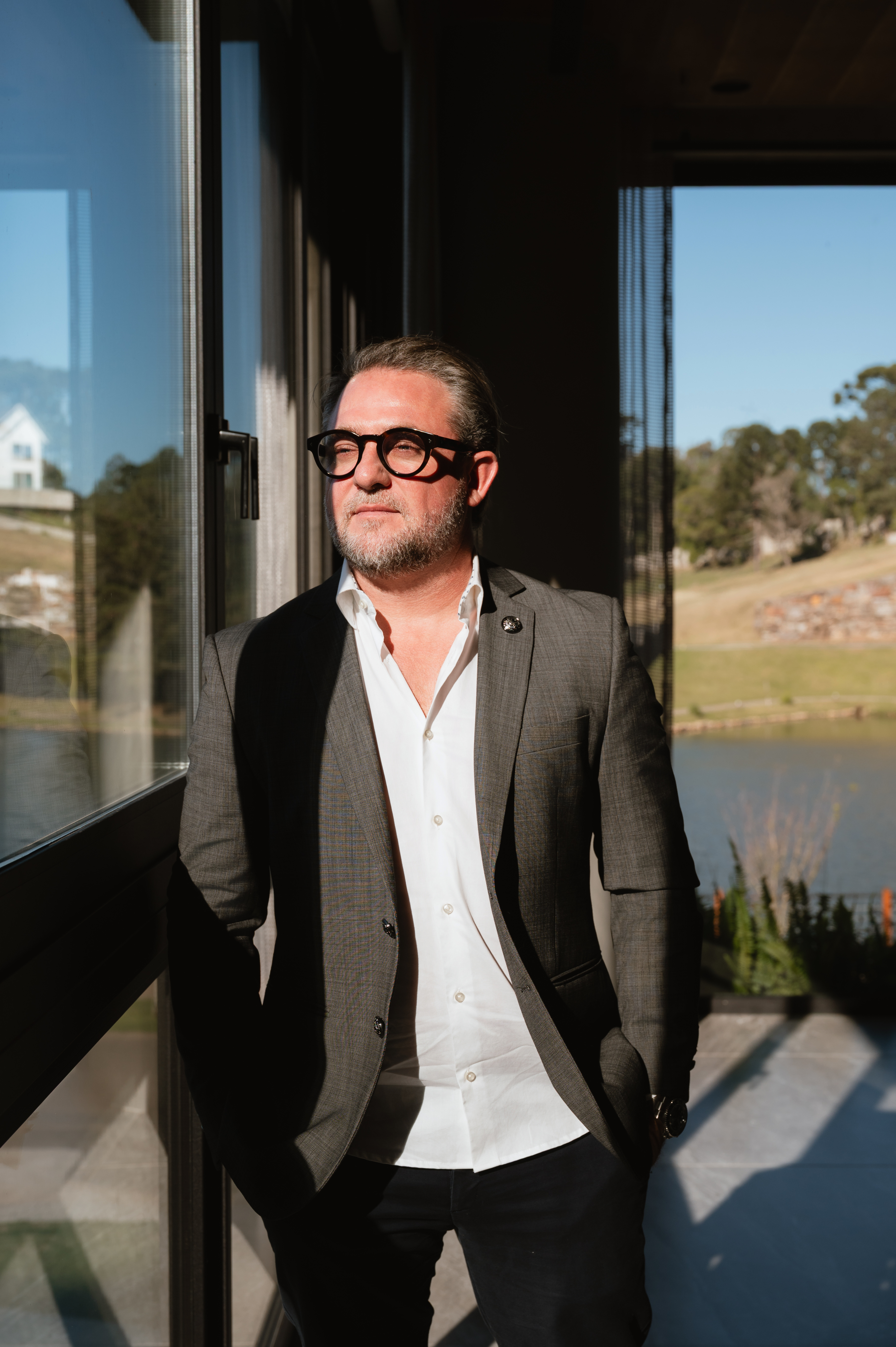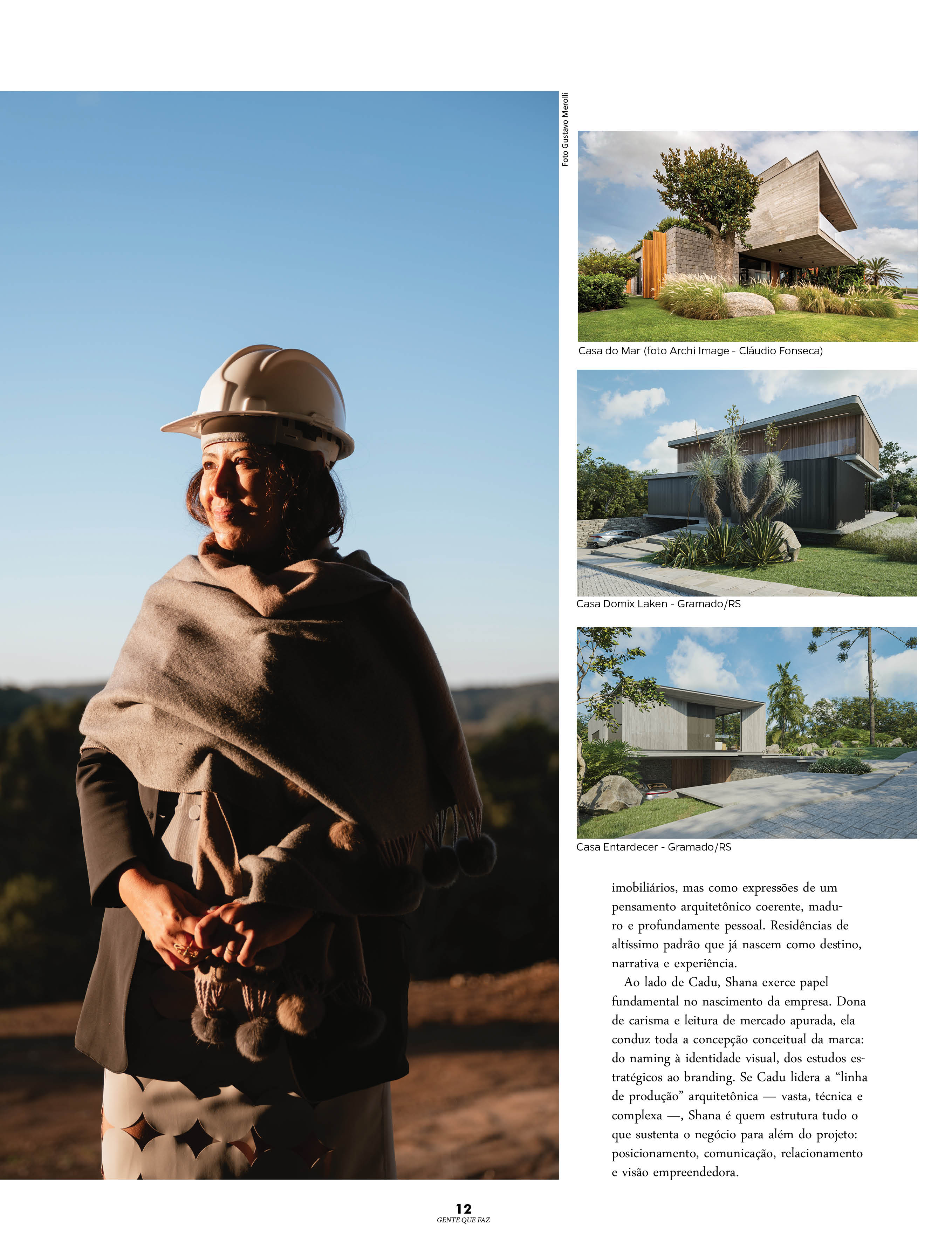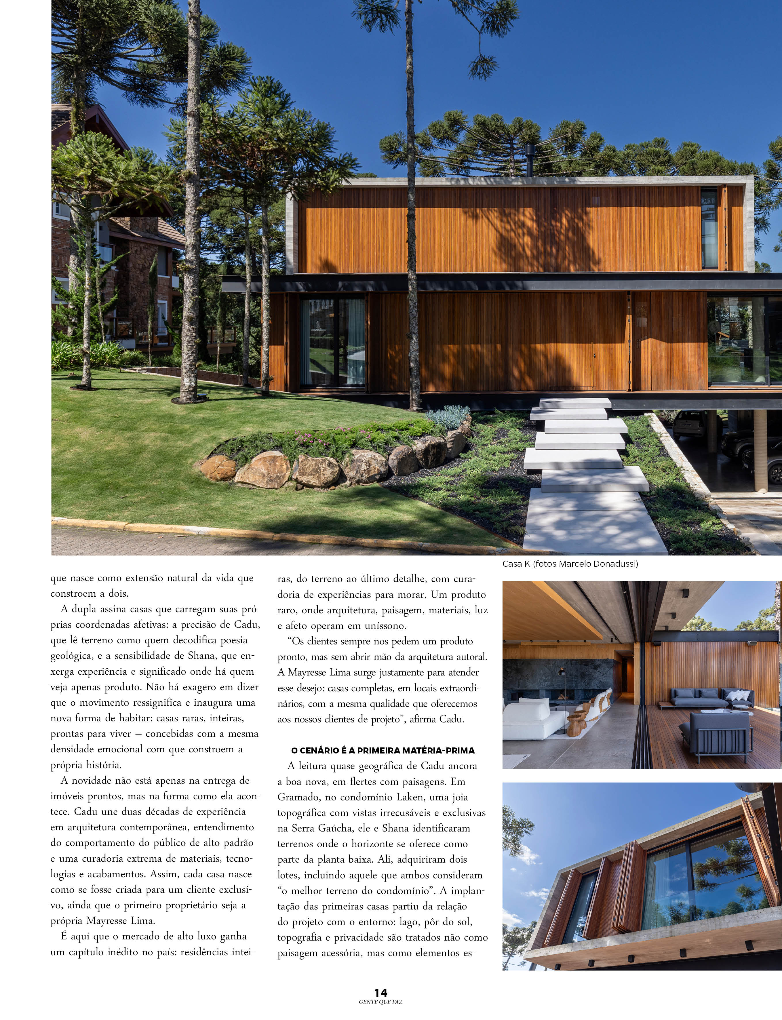 A leitura quase geográfica de Cadu ancora a boa nova, em flertes com paisagens. Em Gramado, no condomínio Laken, uma joia topográfica com vistas irrecusáveis e exclusivas na Serra Gaúcha, ele e Shana identificaram terrenos onde o horizonte se oferece como parte da planta baixa. Ali, adquiriram dois lotes, incluindo aquele que ambos consideram “o melhor terreno do condomínio”. A implantação das primeiras casas partiu da relação do projeto com o entorno: lago, pôr do sol, topografia e privacidade são tratados não como paisagem acessória, mas como elementos estruturadores. Refúgios onde a modernidade se converte em quietude. É o tipo de arquitetura que não grita presença. Ela se oferece, suave.