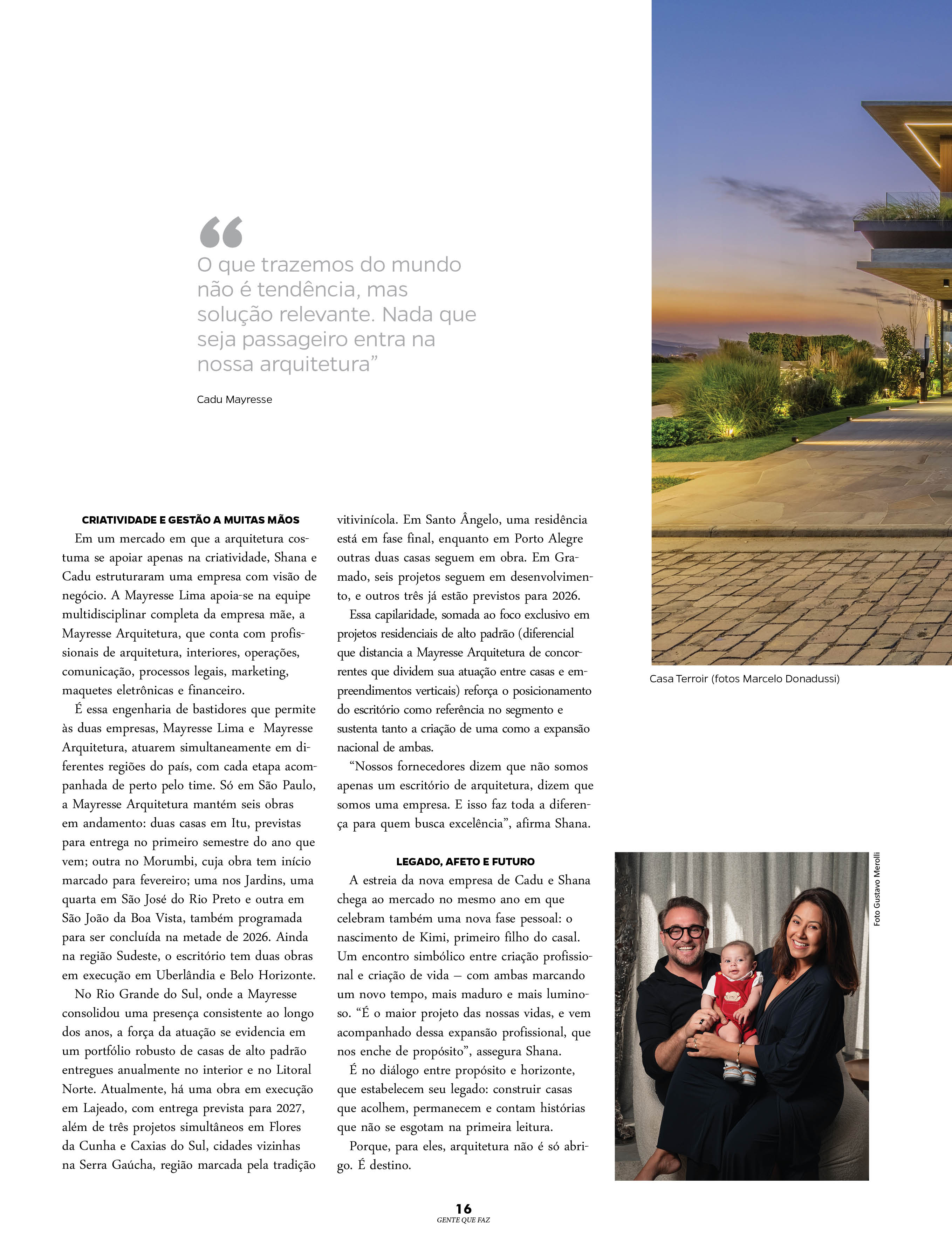 Em um mercado em que a arquitetura costuma se apoiar apenas na criatividade, Shana e Cadu estruturaram uma empresa com visão de negócio. A Mayresse Lima apoia-se na equipe multidisciplinar completa da empresa mãe, a Mayresse Arquitetura, que conta com profissionais de arquitetura, interiores, operações, comunicação, processos legais, marketing, maquetes eletrônicas e financeiro.