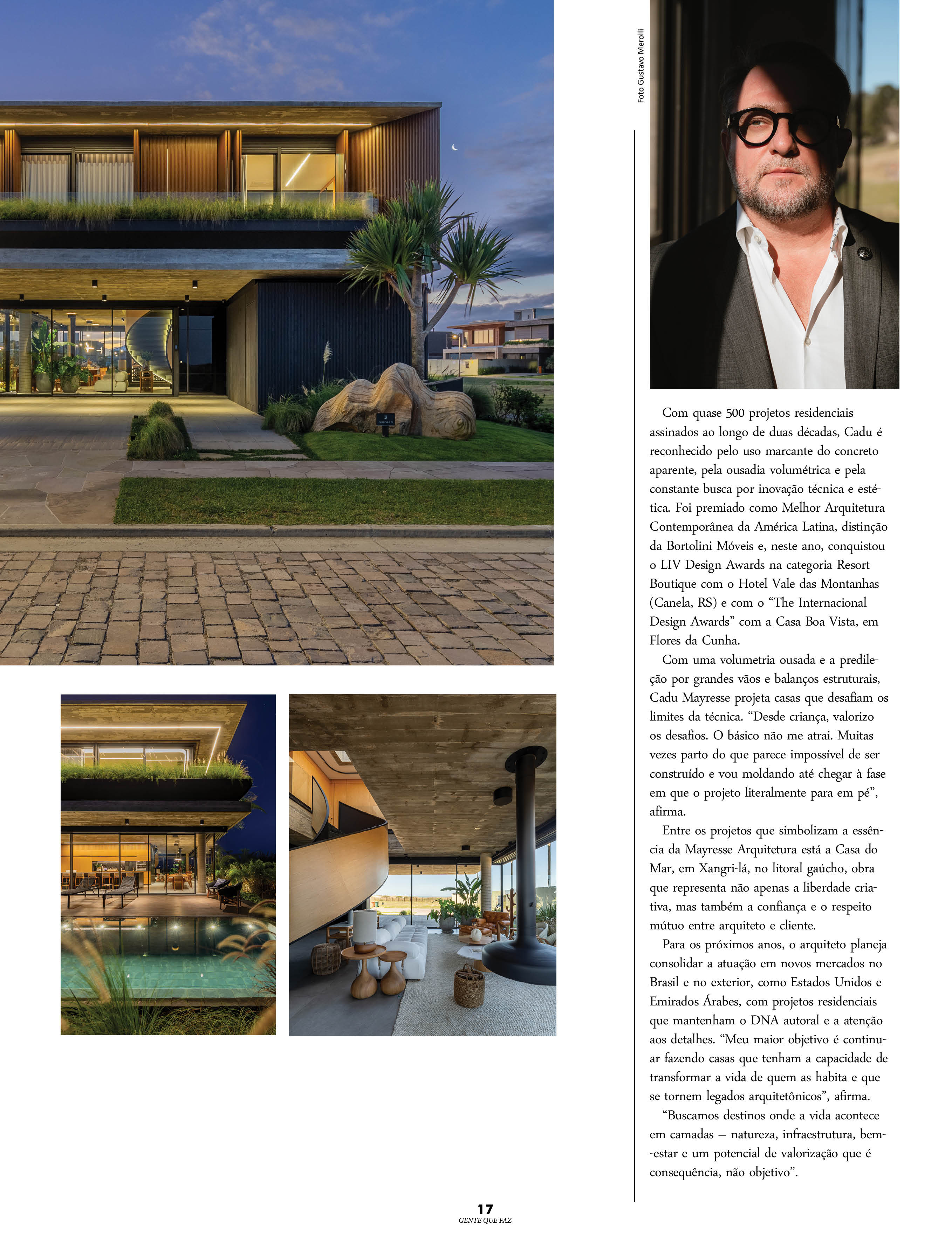 Com quase 500 projetos residenciais assinados ao longo de duas décadas, Cadu é reconhecido pelo uso marcante do concreto aparente, pela ousadia volumétrica e pela constante busca por inovação técnica e estética. Foi premiado como Melhor Arquitetura Contemporânea da América Latina, distinção da Bortolini Móveis e, neste ano, conquistou o LIV Design Awards na categoria Resort Boutique com o Hotel Vale das Montanhas (Canela – RS)
